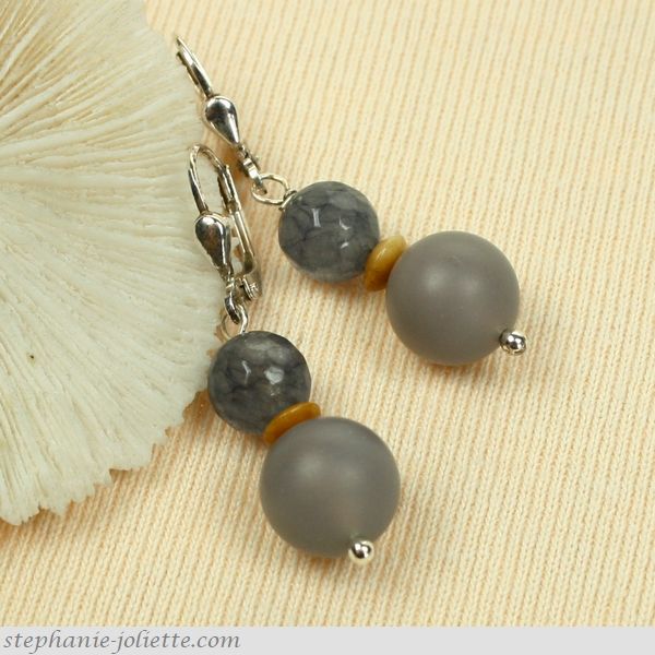SIPEH023-11304OSI / Ohrhänger (925er Sterlingsilber), Süßwasser-Zuchtperlen (gelblich 7 mm), Keshiperlen (braun), Hämatit (Kugeln 4 mm), Größe (47 mm lang, 8 mm breit) / 23.- €uro
